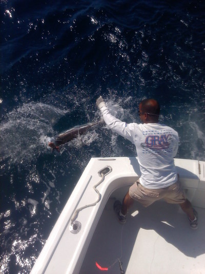 Within 30 minutes of kite fishing, the right long Goggleye started getting nervous and moving erratic on the surface of the water. We could see that the bait was getting chased which turned out to be a Sailfish. We fed the Sail and were hooked up. Rudy was up next as an angler and he fought the Sailfish. Since we practice catch and release, I encourage our customers to get their cameras out, take photos while the fish is in the water and if the fish is not too erratic, I will grab the bill of the Sailfish and bring the fish in the boat. First we get the hook out of the mouth, snap off a couple photos to let the fish swim away to be caught again.