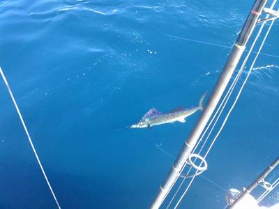 We stopped on our way out to purchase a dozen live Goggle Eyes from T&T Bait in the inlet in Fort Lauderdale. 1.8 miles from shore and 15 minutes from leaving the dock put us in 120 ft of water on the drop off. My plan was to troll first and then do some live bait kite fishing. We had two plainers down, one with a double hook Mullet strip with a pink and blue sea witch in front and the other with a 3 ½ drone blue reflector spoon. For surface baits, we had four Bonito strips out.