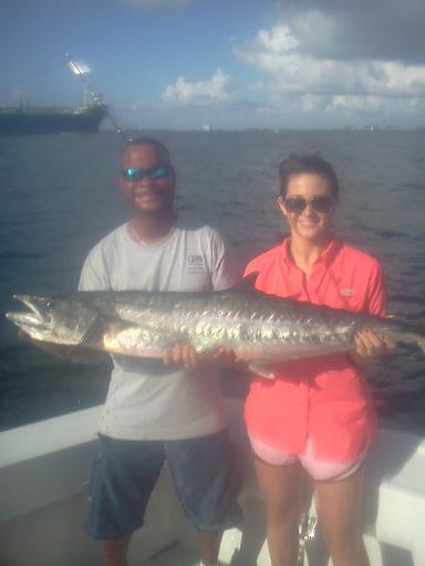 With a strong current going to the north at 4 knots, it was very difficult to do any wreck fishing so our plan today was to do some trolling over the wrecks. We put two plainers down, both with double hook Bonito strips, one with a black and purple sea witch and the other with a pink and white double hook Bonito strip. For surface baits we went with two naked Ballyhoos and two Bonito strips with sea witches in front. I trolled from one wreck to the other catching 5 Bonitos ranging between 10-18 lbs., two Barracudas and three Kingfish, one of them being an Anaconda Kingfish weighing in at 29 lbs. Each family member took turns reeling in the fish with the majority being caught between Tyler, Travis and Jamie with Dad's help, while mother Danelle was the official photographer and record keeper.