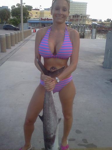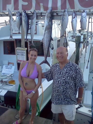 Fifteen minutes after leaving the dock at Bahia Mar, our lines were in the water at the sea buoy in Fort Lauderdale FL, 1.8 miles from shore. We put two plainers down, one with a 3 ½ blue reflector drone spoon and the other with a blue and white sea witch in front of a double hook Ballyhoo. For surface baits we had two Bonito strips and two Ballyhoos and a daisy chain teaser. We trolled around, zig zagging over the reefs in 80 ft. of water out to 190 ft, and we wound up catching 4 Bonitos, 4 Kingfish and two Barracudas. Bryan caught most of the fish while Jackie was the photographer, but she did catch one of the Barracudas and one of the Kingfish with some difficulty due to her unique physique.