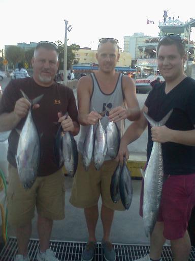 Fifteen minutes after leaving the dock, lines were in 120 ft. of water at the sea buoy in Ft. Lauderdale, 1.8 miles off shore. We started off with two #8 plainers, one with a 3 1/2 blue reflector drone spoon and the other with a pink and blue sea witch in front of a double hooked Bonito strip. For surface baits we went with two Bonito strips and one jap feather down the center outrigger. As I trolled the reefs ranging from 80 ft. out to 160 ft. of water, our first hook up was a Kingfish on the plainer with the 3 1/2 drone spoon. From there the anglers took turns catching five Kingfish, four of them were shorts.