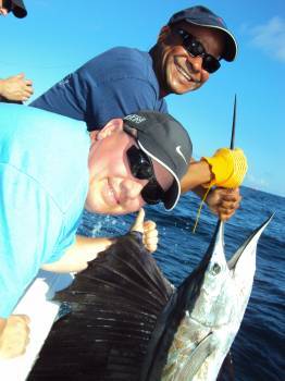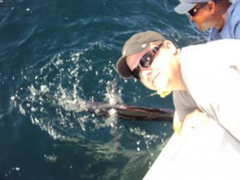 I headed south of Fort Lauderdale to compensate for the current that was going north. In the past couple of days, we have been doing very well with catching Sailfish. I set the two kites out with two live Goggle Eyes on each kite in 350 ft. of water. Our first fish was a Black Tip Shark; Brain was the angler. The second fish was another Black Tip Shark and Ron was the anger for this one. We reset and our Sailfish made his appearance on the left short kite bait. Hooked up!! Brian was the angler, and fifteen minutes later was rewarded with the Sailfish, as Dave, our mate, wired the Sailfish. Pictures were taken and the Sailfish was released. I told Dave to reset quickly as I could see another Sailfish tailing down sea, so he did. Sailfish – right long!!! Ron was our angler on this one. The Sailfish came out of the water showing his brilliant neon colors while tail-walking the surface of the water. Twenty minutes later, Dave wired the fish for picture taking and was released to do battle again.
