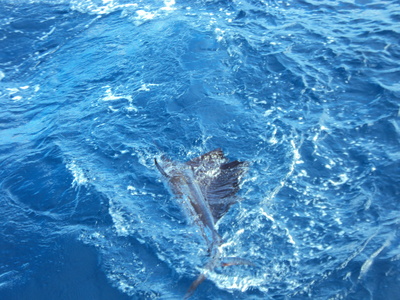 From there we headed out to "shark land" which is an area south of Fort Lauderdale in 350 ft of water. We put out three shark baits, one on the surface, one midrange and one on the bottom, as well as one kite with two live Goggle Eyes. Dorsal fin on the short kite bait as the Shark grabbed the live Goggle Eye and then pulled the hook. We reset the kite and a few minutes later another dorsal fin appeared on the long kite bait. This time it belonged to a Sailfish!!!! The Sailfish circled the bait and attacked the live Goggle Eye. Hooked up!!! – as Robert jumped into the fighting char to do battle. The Sailfish put a great show doing his acrobats. Twenty-five minutes later the Sailfish was wired to the side of the boat by our mate, David. Pictures were taken and the Sailfish was released to fight again.