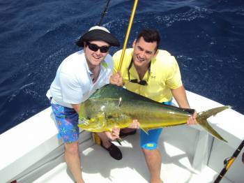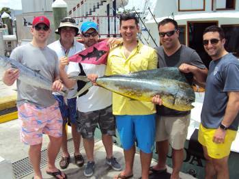 Now it was time to do some Shark fishing. We put out three Shark baits in 380 feet of water - one surface, one midrange and one bottom. A Shark came in on the surface bait – hooked up and the fun began. Our groom to be placed himself in the fighting chair and the tug of war started – line in, line out. Thirty minutes later, Dave, our mate, grabbed the leader and an estimated 200 lb. Hammerhead Shark was released. With time left, we reset looking for another Shark. As the fat lady began to sing, it was time to head back to the dock. Dave retrieved the bottom and midrange bait. When reeling in the surface bait, 10 feet from the boat a blue streak cut across trying to eat the Shark bait – a Bull Mahi Mahi. Our quick thinking mate, Dave, fired out a live pilchard on a spinning rod, and the Bull Mahi Mahi immediately inhaled the bait. Jason was the angler and he worked the fish for the next twenty minutes. As the fish came close to the boat, Dave leaned over with the gaff and with one stroke, the fish was welcomed aboard by the Topshotfishing team. The Bull weighed in at 23 lbs – a great fight on 15 lb. test line with no leader.