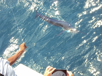 It was Mike's turn to reel in the next fish when one of the plainer rods tripped. Our mate, Dave, reset the plainer immediately and it tripped again – something is playing with the bait!!! On the fourth time the plainer rod tripped, the fish got hooked. After 15 minutes of reeling in and out of fishing line, Dave grabbed a hold of the trace to wire the fish in. The black shadow appeared – a Sailfish on the plainer rod which never jumped!!!!! Pictures were taken and the Sailfish was released to fight again.