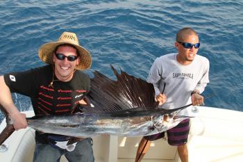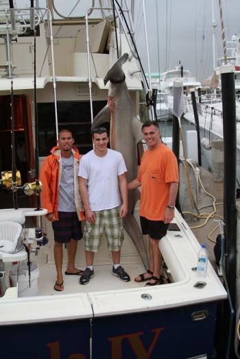 The fisherman sharing our boat this morning also shared the thrill of catching a 6 1/2 foot sailfish! We were on the troll using a pink and white sea witch and fresh-cut bonito strips when the fish hit. After a 25-30 minute fight the fish was close enough to the boat to attach a tag and safely release it, The rain came and went and we ended up catching 4 kings on planers in about 60-100 feet of water.