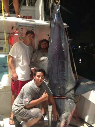 This afternoon the Lady Pamela III had a nighttime tarpon fishing trip scheduled, but before it got dark the crew wanted to try some sharkfishing. A quick run straight offshore put the boat in 350 feet of water, and in 20 minutes they had hooked up a 5 foot sandbar shark. This sure wet our anglers' appetite and they wanted to try to catch another shark, so mates Joe and Dom put big baits right back out. In less than 5 minutes they got a bite from a huge Mako shark. This monster started jumping all over the ocean, with the boat chasing the fish out to 800 feet of water. This was a huge catch; one of the biggest Makos that I have seen caught off Ft. Lauderdale.