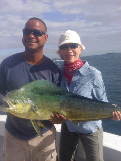 Mrs. Barns and friends from Rhode Island chartered the Happy Day Today along with the Topshotfishing team to do some deep sea sport fishing off of Fort Lauderdale FL. Our objective today was to put diner on the table. We started off trolling with one plainer down with a 3 ½ blue reflector drone spoon; two Ballyhoos, two Bonito strips and a blue and white jap feather were the surface baits. For a teaser, we ran a dredge. As we trolled around the patches of sargassum weed, our first fish was a Mahi Mahi in the 8 lb class. From there we kept catching a few more Mahi Mahi's, one close to 15 lbs. I headed towards one of the artificial wrecks that sits in 350 ft. of water off of Fort Lauderdale FL. As I got closer to the wreck, I could see flying fish exiting the waters, a good signal there was fish there. The left rigger came down and at the end of the line was a 12 lb. Bonito. We kept catching more Bonitos and Mahi Mahi's - there was now plenty of fish for the diner table.