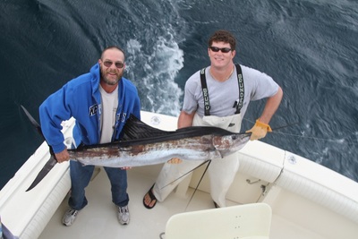 David, and his friends from Indiana, joined Darin and I on the 8-12 morning trip. The trip was for Bob, who always wanted to catch a nice fish in south Florida waters. We bought a dozen live goggleyes from the Fort Lauderdale Marina on the way out. These live baitfish cost extra (from $60 to $100 per dozen) on top of the charter price, but it is well worth it. There was a strong 2 knot south current that morning and the wind was blowing 15- 20 knots out of the northeast, with seas running 4-6 feet. I was running the boat from the tower hoping to see sailfish tailing down sea but I didn't see any. However, there was a large container ship anchored in 140 feet of water, and at this time of year, if there is a ship anchored offshore like that, they hold a lot of bait. That means there are fish there. Once we got to the ship, about 20 minutes after we left to the dock, Darin and Dominic put the kites up. As I have said before, kitefishing is the best type of fish to do in the winter time using live baits. So, right off the bat, with our first kite up, with one bait in the water, we jumped off a sailfish. We got the baits back out ASAP and within 20 minutes we hooked a monster sailfish. Our angler fought the fish all the way out to 350 feet of water before we boated it, took some pictures and let the fish go. It sure made the trip for David and Bob! We also caught a few mahi-mahi as a little icing to put on the sailfish cake! Way to go guys!