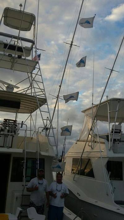 Our day began with a commitment to live baiting small Bonito for hopefully a Sail, Wahoo or possibly a big King. Of course a large Mahi-Mahi would be welcome as well. Live bonito attract big fish. So we set our "bug lines" out the back and the little bonito were snapping everything up and we had 9 or 10 for bait within minutes and off we went. Choppy seas again so 3 lines for two anglers. Wahoo was the primary for Roland and his wife this morning. Caught one yesterday, and that was good, but not one for Roland this morning. We did get two Sails out of three bites and now Roland , who lives in Amsterdam, has four in the 3 trips he has made with us this year so he's happy, but we need that Wahoo. And the water looked so right for one too....fishing.