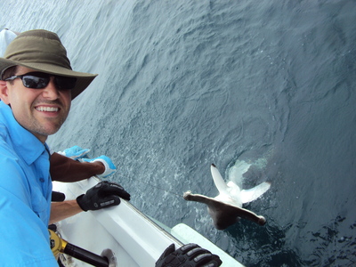 From there James wanted to try his luck for some Mahi Mahi's so we ventured off 8 miles. With no luck, I decided to catch something big for him – hopefully a Shark – so I headed to an artificial wreck located in 393 ft. of water. We put out three Shark baits– one surface, one midrange and one bottom. After a half hour wait, the midrange rod was hooked up as line peeled off the 80 International Reel. James jumped into the fighting chair to subdue his catch. After a forty minute battle, the Hammerhead Shark surfaced. Dave, our mate, wired the Shark to the side of the boat for picture taking, and the 7 ft. Hammerhead Shark was released to fight again.