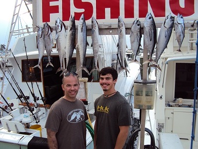 As we trolled the reefs ranging from 80 ft. out to 180 ft. of water, I zigged-zagged back and forth over the reefs while the anglers took turns catching Kingfish and Bonitos. I marked a good amount of fish on one of the wrecks in 210 ft. of water, so we dropped live bait over the wreck which produced two Amberjacks in the 30-40 lb. class – they were both released. From there I could see a color change forming east of Fort Lauderdale, so I ventured out there and found some birds working the area too in 310 ft. of water. Father and son took turns bringing in their fish ending up with a total of 5 Tunas, 4 Kingfish, 4 Bonitos and 2 Amberjacks.