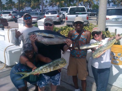 Mahi-Mahi and Blackfin Tuna have been offshore for those offshore anglers fishing in Ft. Lauderdale. Pictured are Bill, Hunn, Michael and April who joined Capt. Chris for a charter. Our usual north current and clean water pushed up to and on top of the outside reef line and made for favorable conditions. Bill and Hunn are experienced inshore and offshore anglers and their guests Michael and April were new to offshore fishing. Pleasant weather this trip and our summer showers have been giving us a break. Very few really rainy days, but we do get some rain this time of year.