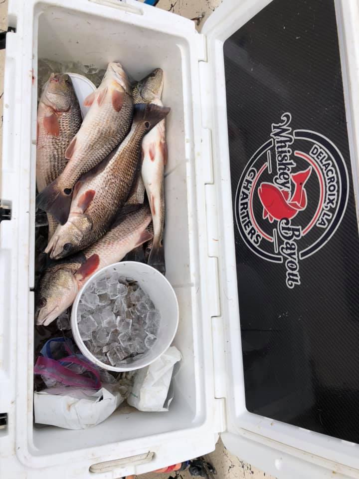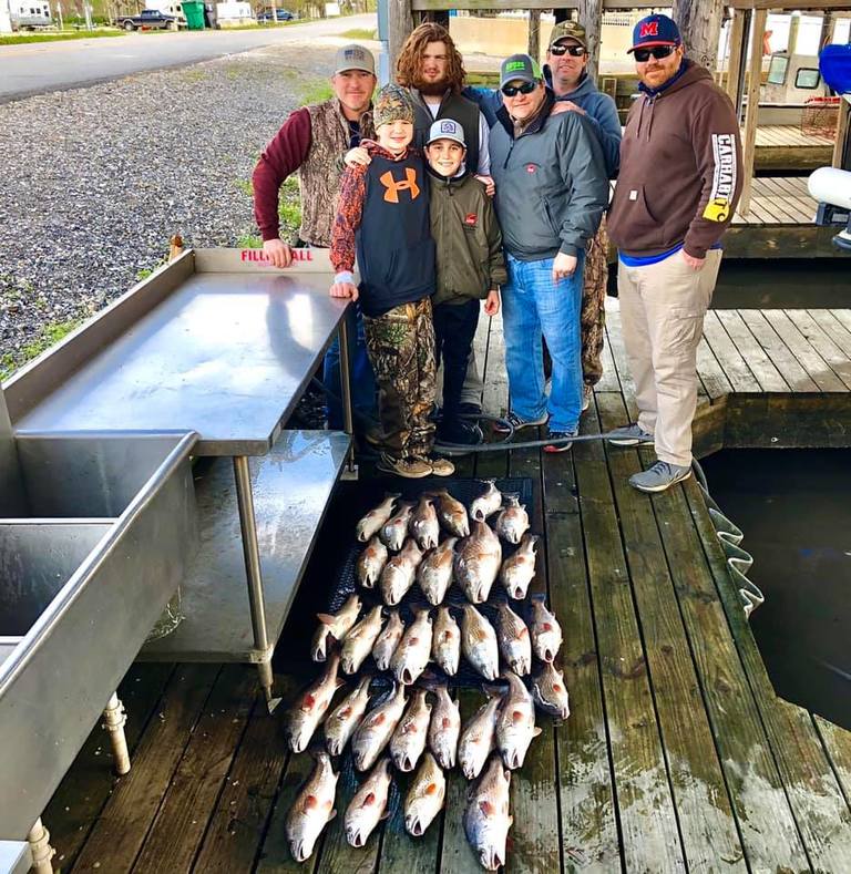 This past weekend we had the Chris Peusch crew out of Canton, MS in Delacroix for a family Christmas gift redfish trip. Captain Corey Gradwohl of Hook and Reel Charters ran the second boat for us today as we both headed out in very high NE winds and cold temps. We fished hard until 2PM before calling it a day. Final tally: 30 keeper reds, 4 cats, and a donor green trout. An absolutely stellar crew that were a pleasure to fish with! Great attitude on a tough day that paid off. Big thanks to Captain Corey running the second boat!