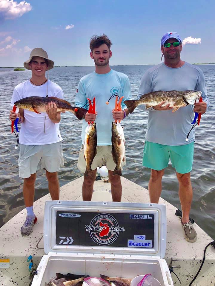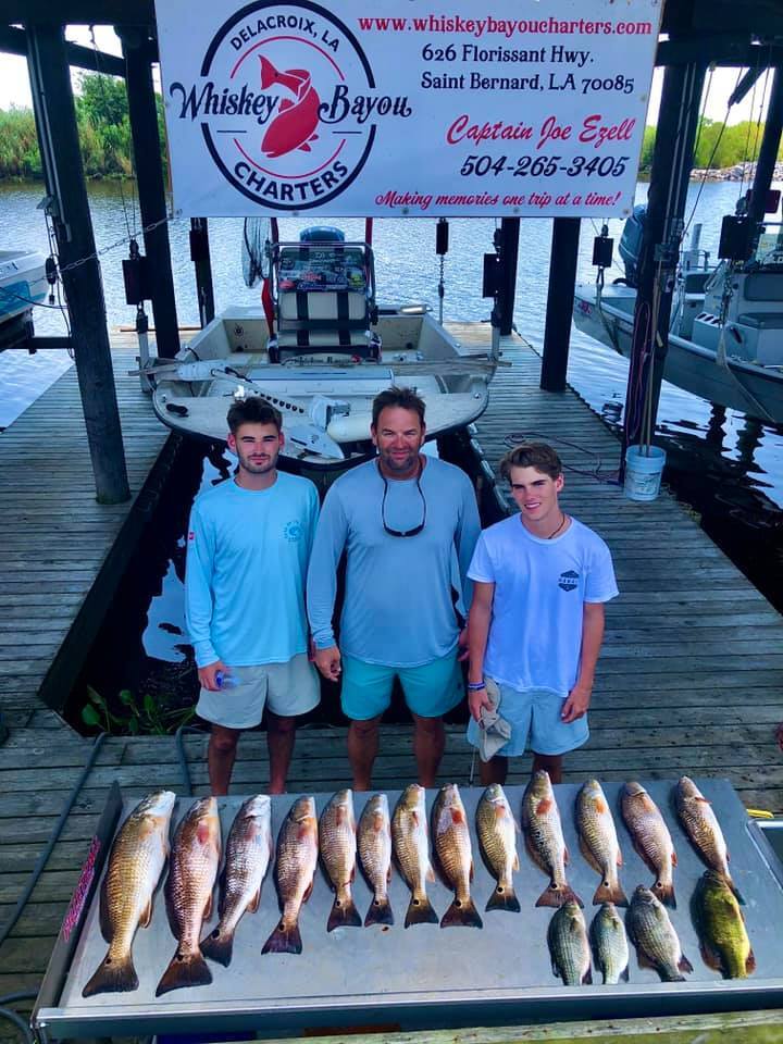 Just recently we had another father and sons team aboard the Majek chasing these Delacroix redfish. We quickly put one in the box at the first stop. Several spots later we got to 3, and 2 massive alligators gar. We fished hard until 1:15, putting 13 in the box, missed a few, and added 2 hybrids and a couple of bass to the box before heading to the dock to get them to work on time. Great crew that was a pleasure to fish with.