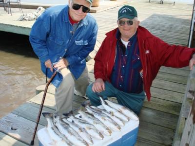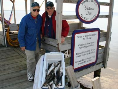 The last time John and Larry were here was in January when we had the coldest two days that we have had in 5 years. The first day we couldn't even fish because they didn't have enough clothes, and that is saying something with two guys coming from New York. Today that wasn't the problem. We left the dock at Victoria Inn just a little before 7am. The only thing I was worried about was finding clean water. The first area was ok, and fishable, but only produced small fish. Our second stop was the gold mine, or should I say silver mine. The trout today were the largest I've seen in a while. They had their easy limit of 50 fish from 15 to 21 inches and more. By the time we quit we were releasing quality keeper trout for tomorrow, hopefully they will still be around. Bait of the day was glow beetles under a cork, but the bigger fish were caught on H&H cocahoes on the bottom. Out again tomorrow with the same guys.