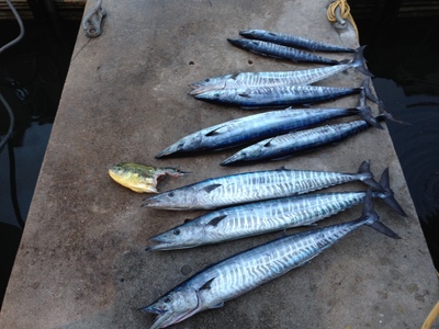 With baits in the water, our anglers were ready to catch a few fish. They were however, somewhat shocked and elated at the outcome. We hooked into a nice wahoo, maybe 20 lbs, and the crew was all pumped up after a big first run by this fish, then working it into the boat. Then we hooked up another one. Then another one. Then another one. Then one after that! By the end of the 4 hour charter our anglers had boated a whopping 10 wahoo! They also bagged a single mahi-mahi that apparently was able to beat the wahoo to one of the baits. It was a busy afternoon for the captain and crew, our anglers were beat, but man o' man this kind of fishing is simply the best! Wahoooo!!!