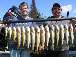 Today's trip with Al and his son Micah from Kingsford, Michigan started out with lots of action, however we were losing fish left and right and catching mostly smaller fish. The weather was really strange this morning for a while, we had a strong west wind kick up, and during that time the bite was really tough, at least for us it was. After the west wind settled down, it got calm, and we headed to a different location. I only went to this deeper water location because I remembered a trip a couple of years ago with the same kind of weather conditions (extremely hot and flat calm) and we did quite well. I guess it pays off once in a while to fish "memories" because as soon as we got all our lines in...we started catching fish. A lot of the fish were suspended in the deep water, so I wasn't real worried about being able to mark them on my Lowrance. Sometimes you just have to fish spots and not worry about marking fish. The fish would come in flurries, we'd go for a few minutes with nothing...then all of a sudden have three fish on at once. It was like that for the better part of two hours. All of our fish were caught on harnesses trolled behind bottom bouncers at .9 to 1 mph. I don't know how many short fish we released today, but it was a bunch. We also lost several nice fish at the boatside or while reeling them in. We released a nice channel cat too that might have gone 6 lbs. or so. We tried some vertical jigging the last hour of the trip, but the fish really shut off about 2 p.m.. Here's a picture of today's catch, good luck from all of us in the Bay de Noc area. Summer is going fast...but we still have some openings for charters this month for you fair weather fishermen!