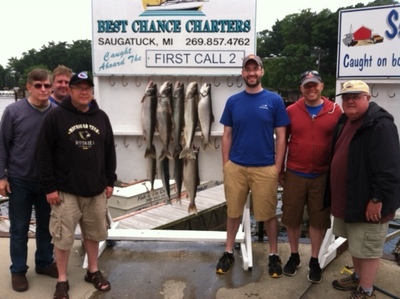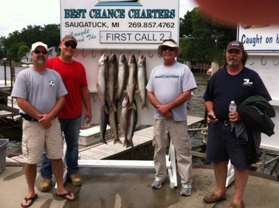 Fishing really picked up off of Saugatuck this week with catches in the double figures and 14 fish boated on Sunday. The bait continues to set up in 100-130 FOW. The lake trout are feeding near the bottom with coho and steelhead near the surface. A few kings were taken usually 50-80 feet down. Best baits for the lake trout were Goldstar dodgers with spin and glows or Rapture flies bounced along the bottom. Our best combinations were chrome/glow with a no-see-um, chrome/lazer with a Oceana, hammered chrome with a green spin and glow, and white with a pearl spin and glow. We had action on coho and steelhead on high divers with small orange dodgers and mini-Rapture flies (wild fern and hyptnotist). On the coppers we caught steelhead on 50-150 coppers with jarger bomb, dbl. orange crush, and coyote Stinger spoons. We expect the kings to move in the bait as it continues to stabilize. Follow the action on twitter @CaptCHcharters.