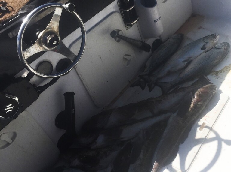 Salmon fishing has been better than normal for April so far. Our guy Dan has consistently been hitting between 6 to 12 fish per trip about 10 minutes from the harbor. The salmon are biting on little fish Hoochie‘s and small spoons like normal for this time of year. There seems to be quite a bit of bait around, especially middle fish. The salmon have mostly been between 7 to 15 pounds but there are a few larger ones around as well.