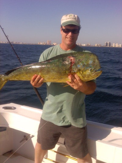 The past couple of days here in Fort Lauderdale FL the winds have been out of the north east at 15-20 mph, seas running 5-6 ft. with occasional 8 footers, making it quite sporty. These northeast winds blew the blue waters closer into the reef accompanied by sargassum weed. These conditions have allowed us to have the best Mahi Mahi fishing all year long. Mahi Mahi's have been running from 5-25 lbs. mixed in with an occasional Wahoo, if you are fortunate enough to find boards floating in the weed lines.