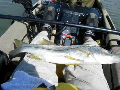 We fished as we went, and were soon into action. We caught snook and redfish at each spot we stopped to fish. Dan caught a couple of redfish, and I caught another. But, the snook action was the real surprise. As we fished our way along Dan and I put 14 snook into our kayaks. They ran from first and second year juveniles to 26", and it was good to see the juvies. I had many snook follow my jig right to the end of my rod and strike it as I was lifting it out of the water to cast, again. I also had one nice snook cut me off, probably on the oyster cluttered bottom. And, caught one small snook on a topwater plug. Dan I think, had similar experience, and lost a nice fish right toward the end of the day.