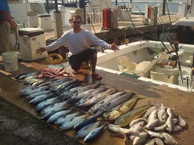 Today was our all day dolphin fishing trip on the Lady Pamela III. A total of 14 anglers were on the boat and they enjoyed one of the greatest all day trips we have ever had. We started the morning out trolling with fresh bonito strips, and in no time we had limited out on kingfish. Then one of our anglers, Aaron, and his 4 year old daughter, hooked up and landed a sailfish. After catching all of these fish, we tried some snapper fishing, and limited out on the vermilion snappers! Next stop was gray tile fishing and we caught our limit of those as well. It was nonstop for Captain Adam. Oh, by the way, we also boated 5 blackfin tunas and four bonitos. What a stunning day out there on the water.