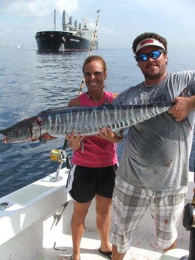 Duane and family came fishing yesterday morning for some south Florida fun. It was time to try their luck deep sea fishing while here on vacation. Our first stop was to fill our 100 gallon live well with a few live blue runners and small bonitos as fresh bait for the trip. We started our first troll with two baits on planer boards. The planers are designed to bring baits to 65 feet below the surface. These deep baits are irresistible to king mackerel, wahoo, and blackfin tunas. We also put out four top baits, each skipping nicely across the top of the water. Today the fish were biting between 140 ft and 350 feet where a nice north current was running. We fished the edge of the current break and caught a few nice big bonitos, three kings and a feisty 25 lb wahoo. That wahoo was a nice end to the trip. Hurricane Irene is due to stir up the weather later this week so this turned out to be a nice fishin' day.