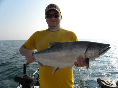 Right away I knew that if we wanted some Kings there was a pile of them down on the flats. We started off right in front of the Oak and did the same troll down to the flats as yesterday. However, today the water chilled down and the temp came up. at one point we had 50 degrees down 50. The screen was blank, and we sat for the first hour and a half with not even a sniff. We finally made the decision to head deeper and that's when we found a little "honey hole" at the 24N/6W line. A great mix of Kings, Cohos, Atlantic's, and Rainbows. There was a break between 60 and 70 that was 15 degrees and the fish were all over it. If it weren't for the rods poppin' you would have never known there were fish there. The screen on our Hummingbird was BLANK the whole time we were out there on that 175-250.