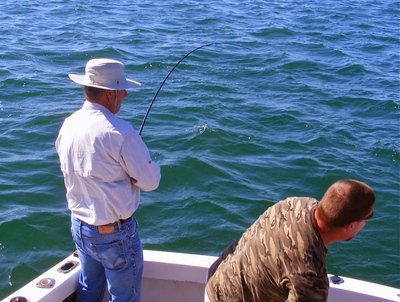 Something else I have found is that if you use a braid line you can put more backing on the reel and because there is no stretch to the line you will feel every move the fish makes. On more than one occasion, when I was using mono, the angler has been almost spooled. With the braid line and more backing this is less likely to happen. However, it does lend a bit of excitement to the fight when you almost run out of line and you have to back the boat up. This gentleman has a good size bluefish on a very light action Shimano bait casting rod with a small Shimano level wind reel. We are using 30 lb. test braid for line on this set up so rather than using a light line with a light action rod you've got a heavier test line and you are able to put a lot of juice to the fish and enjoy the full action the rod gives you.