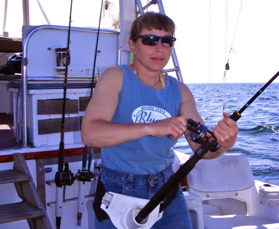 There is another way. You can troll a light action boat rod with a small saltwater conventional reel in areas you know hold fish. A hootchie or swimming plug will work just fine. Once you are hooked up you can enjoy fishing a bass or bluefish on as light a test line as you like just so long as the rod and reel setup is suited for the line test you are using. The woman is fighting a 30 inch striper on 12 lb. test mono line on a completely custom rod I had made at the Goose Hummock. I've also taken some good sized bluefish with this rig. Believe me, it is a lot of fun especially when the fish gets close to the boat. By trolling this tackle you can cover a larger area looking for the fish and once you find them concentrated in an area you can cast to them with the same gear once you've learned to cast a conventional setup.