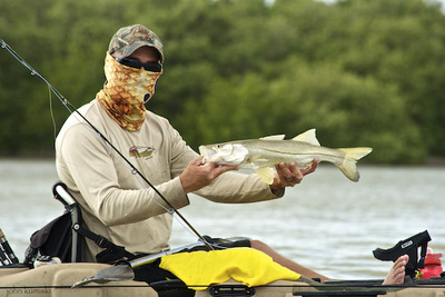 The current was flowing hard the wrong way at the next creek we came to. We ate lunch, then Mike took a cast with the Tiny TerrorEyz. BAM! Nice snook. He got five on six casts. I got a jack and a small snook, but no way could I keep up with Mr. On Fire. He got at least a dozen fish, maybe more. Then the current slacked off, and we paddled down the creek.