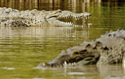 We came to a place where there were at least a dozen large crocs all laying around. Our appearance sent several scurrying into the water. Some just remained where they were, unconcerned. We took some photos.