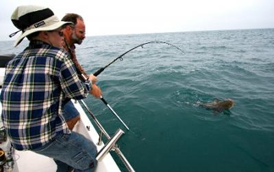 Meanwhile Daniel had his hands very full with what turned out to be by far the largest fish he'd ever caught, a cobia in the 38 inch range, probably about 20 pounds. Shawn eventually gaffed it and we all had fish for supper last night.