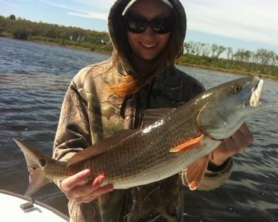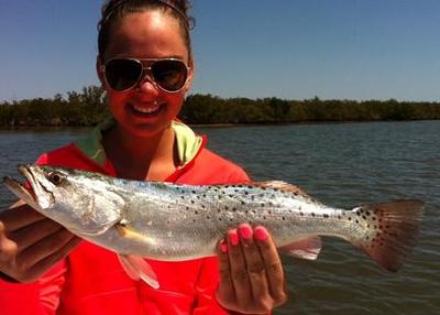 After a very mild mid winter, March arrived with chilly winter conditions in east central Florida, dropping water temps back into the upper 50's for much of the month. Spring time is great for backcountry mixed bag fishing, returning from south Florida are the schools of inshore migrating gamefish eager to feed as they make their way north on an annual trip from winter haunts, following the rising water temperature change and ending up by summer as far north as the Outer Banks NC area. Joining our resident backcountry Spotted Seatrout, Redfish, Sheepshead, and Black Drum will be larger numbers of Jack Crevalle, Bluefish, and Ladyfish making for lots of fun rod bending. Light tackle free line fishing with live shrimp and soft plastic DOA lures are my main technique for fast action. Samantha pictured with a good Seatrout while on her family's mixed bag trip with me.