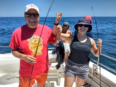The boat “Star Fish” has been fishing daily with good catches of sea bass and fluke. One day rods bent with over 100 fish in less than 4 hours. Keepers are mixed in with lots of short fish. One day Captain George and mate Marlyn fished with a family group of five from Harvey Cedars. The day’s highlight was when Marissa and her father Louis used teamwork for the largest sea bass of the season. They both hooked at the same time and reeled their lines in together.. When the fish was brought up, it had the hooks from both anglers in its mouth. The fish measured 18-inches.
