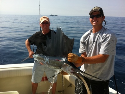 Today Lamar Scott and bob came fishing aboard the lady Pamela IV. We stared the trip out trolling using fresh Bonita strips and new sea witches with a 80 foot leader the fishing was great. The first few fish were 15-20 lb kingfish Scott and Lamar both caught the first two our next couple of bites where black fin tunas around the 5- 8 lb range in 200 feet of water is where we are catching the black fin tunas . Next all of a sudden a nice sailfish on the right long rigger I was in the cockpit and I told paul to put the boat in a turn well I feed the fish now I yell I've got him and it was jumping all over the ocean it makes one great trip if you catch Atlantic sailfish.