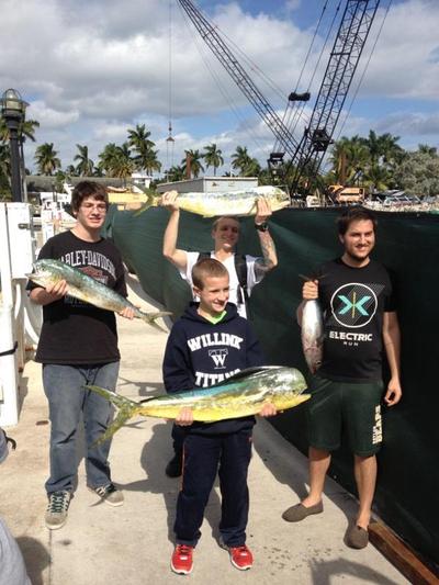 Today we had Judy and her family from Fort Lauderdale out for one great four trip. The Lady Pamela II was set up to troll for most of the trip and our anglers started off with a couple of skipjack tunas. We stumbled upon a floating metal container off a cargo ship and we got eight nice dolphin up to 15 pounds plus a few nice blackfin tunas. What a fun day!