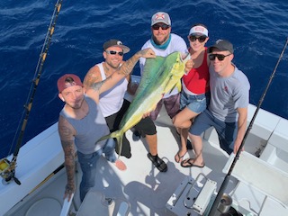 There was a color change forming with a couple of birds working the area east of Fort Lauderdale. As we trolled the color change, the right rigger came down – Mahi Mahi! Shawn was the angler on this fish – this Mahi Mahi was bigger than the first Shawn caught and put on a good fighting show. Shawn brought the Mahi weighing 20 lbs. to the side of the boat and Russ put the fish in the fish box.