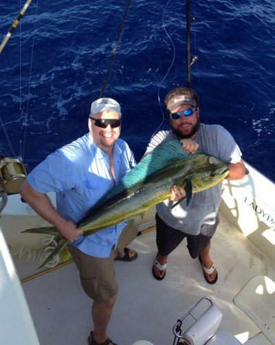 Fishing for Dolphin (Mahi-mahi) around Fort Lauderdale has improved tremendously this week. It has been an absolute blast going off shore a ways and finding large beds of seaweed. While the seaweed is tough to deal with as far as keeping the baits clear, it's worth it when you see Dolphin racing out from under those beds and heading for your rigged baits.