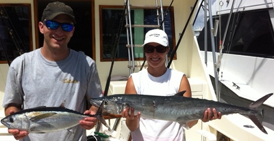 Our planer rods accounted for 90 percent of the bites today. Our usual 5 to 6 inch Bonito strip on a long leader fished on those planers fooled the Kings today. Schools of medium sized Bonito are swimming quickly to the north. No Wahoo today. Slightly cloudy water on the reefs and the pink colored baits worked best. Calm sea conditions also contributed to the deep lines being so much more productive than our surface ones. The surface lines can be quiet when the ocean is flat.