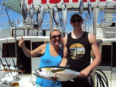 We trolled the drop off ranging from 90 ft. out to 350 ft. of water. Devin was our angler while Sara took videos of his actions. Devin caught a total of five Bonitos and five Tunas, one weighing in at 24 lbs.