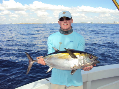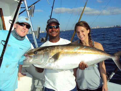 Twenty minutes after leaving the dock, fishing lines were at the sea buoy in Fort Lauderdale in 120 ft. of water, 1.8 miles from shore. We started off trolling with two #8 plainers down, one with a 3 ½ blue reflector drone spoon and the other with a pink and blue sea witch in front of a double hooked Bonito strip. For surface baits we went with two Ballyhoos and two Bonito strips. We trolled the reefs zig-zagging in and out from 100 to 300 ft. of water. The two anglers took turns bringing in a total of four Bonitos, three Tunas and one Skip Jack Tuna. We decided to make a drop over a wreck in 250 ft. of water with live Bullets. Charlie was our first angler and he reeled in a 35 lb. Amberjack – pictures were taken and the fish was released. Next up was Marissa and she reeled in a 44 lb. Amberjack, which was also released.