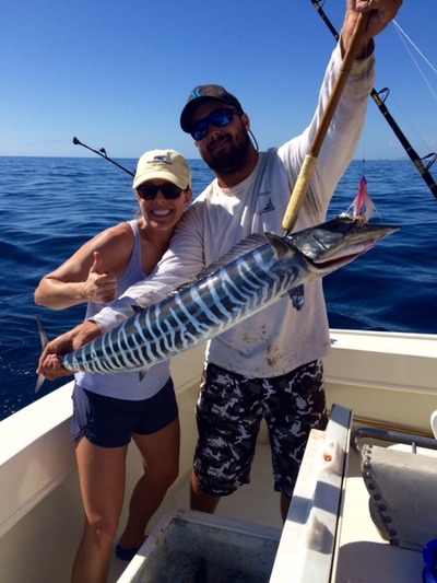 We continue to pick away at the Sailfish with the majority of these fish inside of 200 feet of water on most days. They were outside of 200 a couple of days when the current was strong and the water clear with blue water on top of the reefs inside of 100 feet. Although we scored Blackfins in the shallower clean water with that considerable current we were surprised that the Sails chose to fight the current out in the deeper water. We did slide deeper in time to get in on some of the action. It looked so perfect for them in the shallow water but they liked it deeper and it seemed against the grain, but they go where they please and we guessed wrong early. When you hook them in strong current they seem to have a few more horsepower in the tank and often really take off when they feel the hook. Mahi-Mahi are being taken and of course like the clean water. They are moving very rapidly south. We had a good week on the Wahoo. Trolling has been best for them but Capt. Chris did have a couple of good ones on live bait just off the edge. Pictured is Betsy who joined us along with here husband. And a beautifully lit up Wahoo that joined us a well, taking a trolled bait in 180 feet of water.