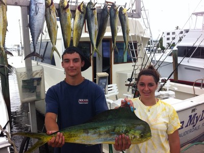 Good weather as predicted today with mostly lots of sun and good sea conditions. Chris did a bit of exploring off the edge today and the end result was some good action on Mahi-Mahi (9) to go with the usual Bonito and Barracudas. Pictured are Bret and Rachel.
