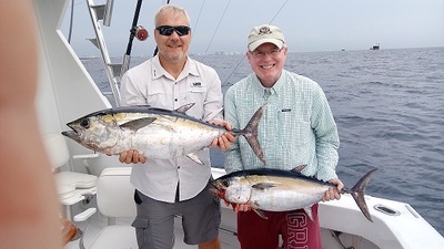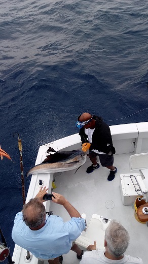 All of a sudden we got a double header strike which ended up being a couple of 30 pound Blackfin Tunas. Bob and John were the anglers. Dave, our mate, gaffed the Tunas and put them in the fishbox. We continued fishing and ended up catching a good size Kingfish.