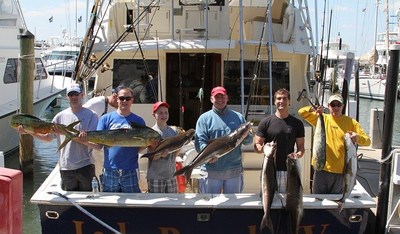 Travis, Mike, John and a few others came fishing aboard the Lady Pamela IV early this morning. The past few days of fishing have been great, with a very nice edge in 750 ft of water. I explained what was happening offshore and the gang decided to buy a dozen goggle eyes for live bait kite fishing. Within 30 minutes of fishing offshore, we caught a 10 lb Dolphin (Mahi-Mahi) on the kite bait. New bait went out and another Mahi-Mahi ate. Two hours before the trip was over, we hooked a double header Mahi-Mahi. After 15 minutes, Travis' Dolphin was in the fish box while Mike's Mahi-Mahi was still fighting. Fourty-five minutes later, Mike's 35 lb Dolphin was gaffed and inside of the cockpit. It wasn't long before the feisty Dolphin jumped OUT of the cockpit and back into the blue. On the way back inshore I was riding in the tower and spotted a Leather Back Turtle with a school of Cobia. JACKPOT! I quickly spun the boat around and we pitched live goggle eyes into the crowd. A double header was on the line in no time. We called it a day with 6 chunky Cobia.
