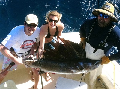 Things were starting to look up for the afternoon trip. Mark and Megan from Dallas joined Donnie from Tennessee with Captain Paul and me. We ran south to Dania pier, set the Shark fishing, and Sail fishing spread out in 110 ft of water. The Lady Pamela I was also looking for the bite live bait kite fishing. Thirty minutes into kite fishing, I got a call from a fishing friend with great news. We packed up and headed offshore to 700 ft of deep blue water and a rippin north current. I called the Lady Pamela I and they weren't too far behind us. Within just 20 minutes into live bait kite fishing in deeper water, Donnie hooked a nice size Sailfish and fought him all the way to the boat. Tag and release was expertly performed and we went on our way after a few high fives. The Lady Pamela I went 2 for 2 on the Sailfish bite and spotted 3 more fish free jumping. The Mahi – Mahi showed their faces with the Sailfish as well. Fishing in Fort Lauderdale was a great this afternoon.