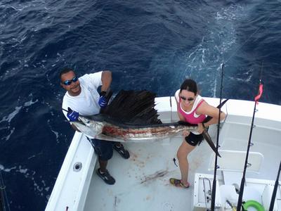 Our first fish was a Kingfish from the left long kite in the 10 lb. range, followed by a couple more 10 pounders. As we set up the kites again in the same area, the predator made his appearance - a black shadow swam underneath the right short kite bait. He rose out of the water with his bill and dorsal fin exposed, as the Sailfish attacked the live Goggle Eye. Immediately the Sailfish came out of the water as he tail-walked towards the boat in the typical Sailfish fashion, trying to dislodge the hook from his mouth - a draw-dropping experience!!!! The fight was on as Mrs. Kennedy kept the line taught and did a fantastic angling job. Twenty-five minutes later, Jackson, our mate, put the Sailfish in the boat for picture taking, afterwards the Sailfish was released.