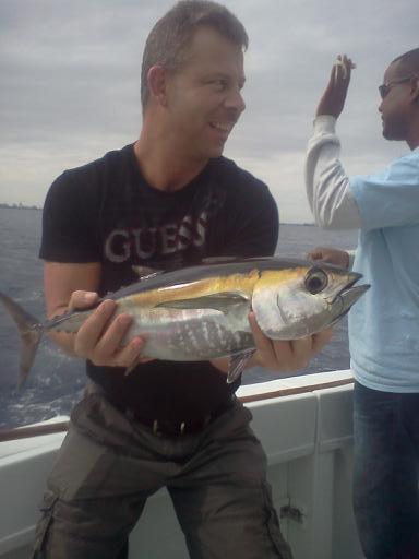 Day Today to let the plainer lines sink deeper. It worked – our first fish bit the double hook Ballyhoo, which was a Black Fin Tuna. As I worked the area we kept picking away at more Tunas, more so on plainers than on surface baits. We ended up with 6 Black Fin Tunas and 2 Bonitas – the Tunas will turn into excellent sushi and Tuna steaks for tonight's dinner.